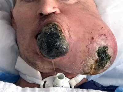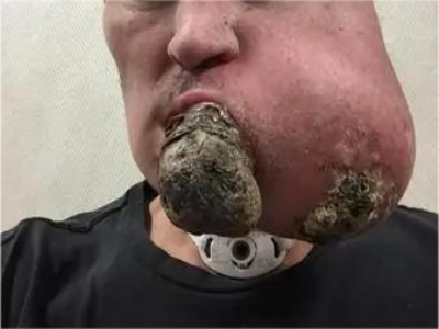 滑膜肉瘤会发生于颜面部,但较为少见,表现巨大的肿物,从脸颊部位完全突出,甚至部分从口腔内突出来,患者无法正常吞咽,可能出现呼吸困难。