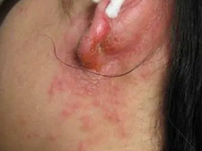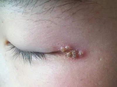 单纯疱疹常见于患者下眼睑,表现为皮肤发红、肿胀,其上有许多水疱,簇集状分布,部分融合成团,疱液浑浊而呈白色,自觉疼痛。