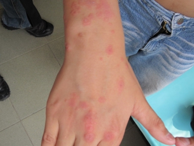 单纯疱疹症状为患者手部上出现多个多形性红斑,散在或群集状分布,部分损害相互融合成条带状,直径为数毫米至2cm,并向胳膊扩展。