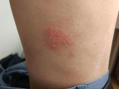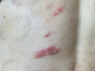 单纯疱疹症状为患者背部起了多个散在的红斑,直径为1-3cm不等,形状不规则,边缘不整齐但清晰,表面粗糙不平,水疱破裂后遗留有黄白色的痂皮。