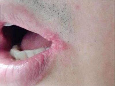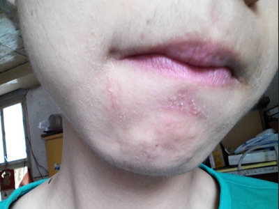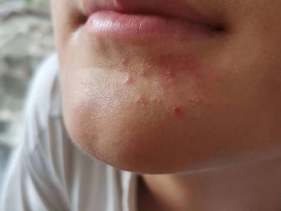 单纯疱疹患者下巴出现红色丘疹,周围伴有红晕,聚集出现,部分丘疹发展为小水疱,顶端微微发亮,由于局部有瘙痒等不适感,搔抓后皮损发生破溃露出红色底面。