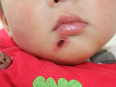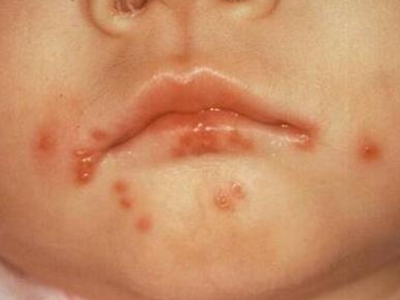单纯疱疹表现为患儿面部出现了群集状分布的黄色水疱,针尖至粟粒大小,微微凸起于皮面,外周有圆形的鲜红色晕,与周围正常皮肤界限明显。