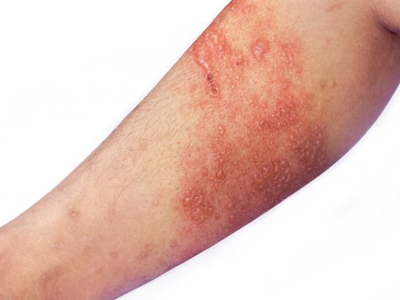 单纯疱疹发生于胳膊部位,表现为初期患处皮肤发紧、烧灼感,出现红斑,继而在红斑上有簇集成群的小水疱,针头至绿豆大小,晶莹透亮。
