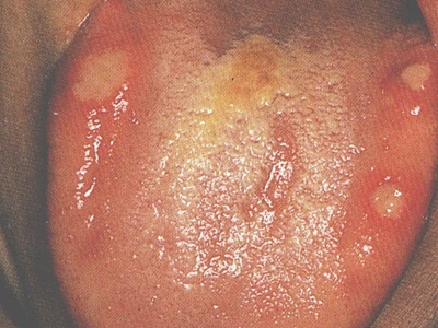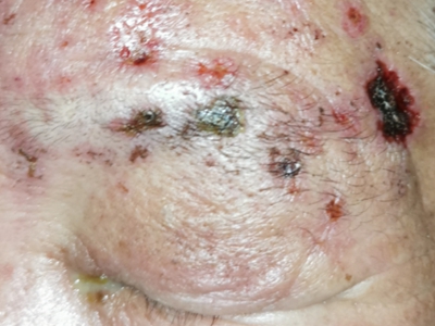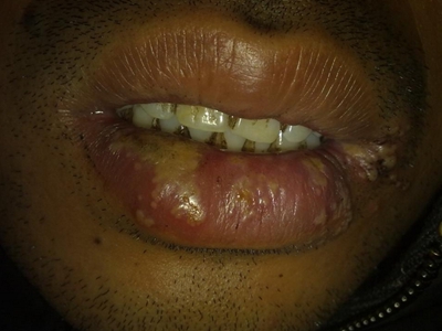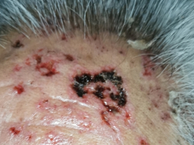 单纯疱疹头部起了形状不一的红斑伴溃疡和黑痂图