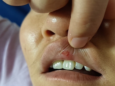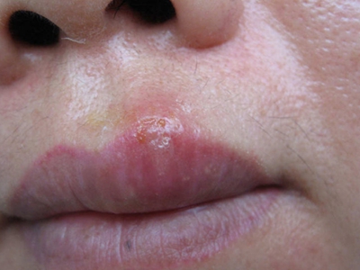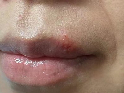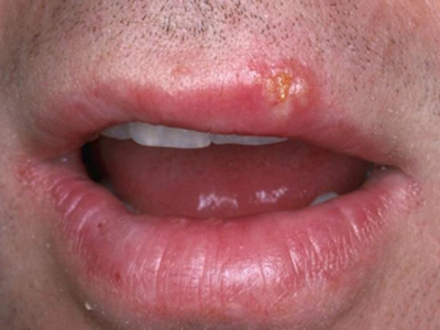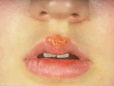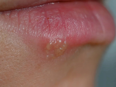 单纯疱疹发生于皮肤黏膜交界处,如嘴唇,皮损表现为迅速发生的簇集性小水疱,晶莹透亮,然后逐渐变为脓疱,破裂后疱液渗出并结痂。