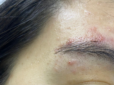 单纯疱疹发生于前额,皮损表现为片状局限分布的簇集性水疱,基底潮红,水疱破后形成糜烂面,伴有渗出,干燥后结成淡黄色痂,如蚕豆大小。