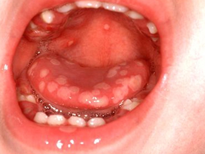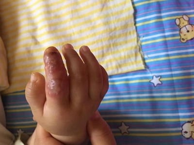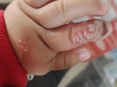 单纯疱疹初期局部皮肤发痒、灼热或刺痛,进而充血、红晕,后出现针头或米粒大小簇集水疱群,基底微红,可见患儿手指上同时出现多簇水疱群。水疱壁薄,疱液清亮。