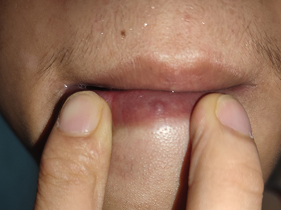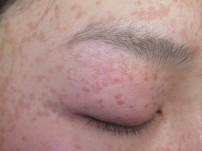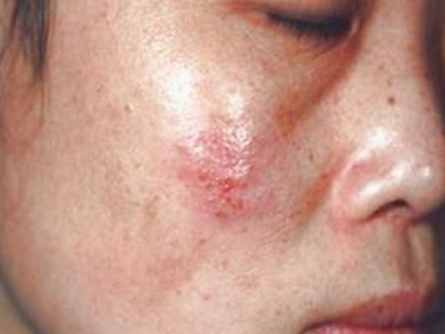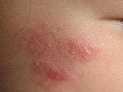 单纯疱疹症状较轻时,表现为面部出现许多红褐色的斑块,部分可相互融合成片,继而出现许多针尖大小的丘疹,微微隆起于周围皮肤。