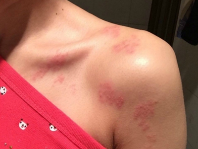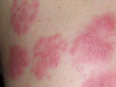 单纯疱疹表现为患者背部起了多块红斑,呈地图状,散在分布。表面粗糙不平,其上有许多针尖至粟粒大小的丘疹,并在其中夹杂有点状或岛屿状的正常皮肤。