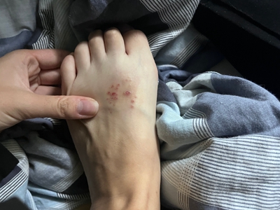 单纯疱疹患者脚背皮肤上出现密集的糜烂红斑,是由于水疱破裂所致。糜烂面从针尖到黄豆大小不等,颜色鲜红,边界清楚,相互不融合,周围有死皮覆盖,伴有明显的瘙痒、疼痛。