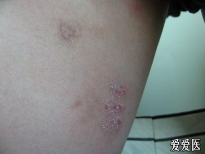 单纯疱疹大腿上起了大块红斑伴密集成团的白色水疱图