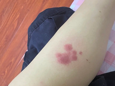 单纯疱疹患者的大腿内侧有几块红斑,大小不等、分布不均,红斑周围有一圈白色的脱皮,消退后有轻微色素沉着,皮肤颜色略深,随后能够自然淡化。