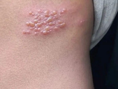 单纯疱疹发生在胳膊内侧,为群集的小水疱或丘疱疹,呈圆形,针尖至粟粒大小,凸起于皮肤表面,触摸有粗糙感,周围绕有红晕,可能会伴有疼痛感。