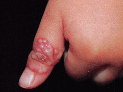 单纯疱疹发生于手指,特征为皮肤、黏膜成簇出现水疱、丘疹,粟粒至绿豆大小,一段时间后水疱破溃,出现浅表糜烂、渗出,易复发。