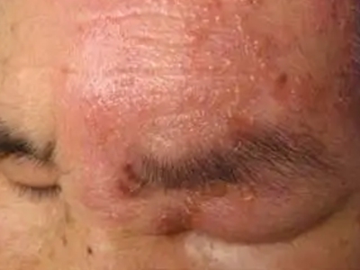 单纯疱疹常见于额头,症状为密密麻麻的丘疱疹,呈圆锥形隆起于皮面,界限清楚,直径为1-2mm,顶端附着有大量的白点,部分相互融合成片。