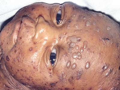 单纯疱疹发生于面部,表现为发生迅速的簇集性水疱,针尖至绿豆大小,基底潮红,内有疱液,开始澄清,然后逐渐浑浊,破后渗液、结痂。
