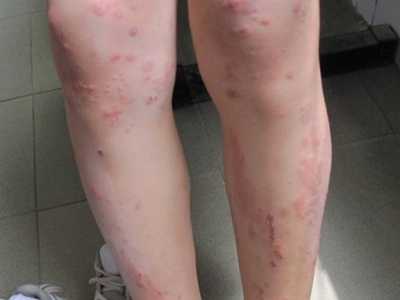 单纯疱疹导致患者双腿腘窝处长出很多红红的丘疹,随后丘疹顶端长出水疱,疱壁比较薄,而且容易破,破溃后会结痂,痂皮比较薄,能够自行吸收,一般不留痕迹。