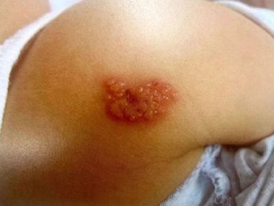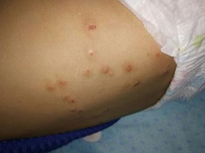 单纯疱疹小孩大腿根部及阴囊多发水疱图
