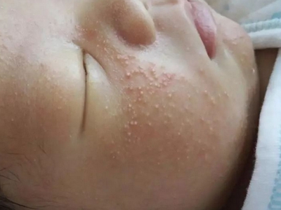 单纯疱疹可见患儿面部出现密集成片的小丘疹,像小痘痘一样,簇集状分布,部分可相互融合,针尖大小,呈点状隆起,顶端微微发白,周围有轻微的红晕。