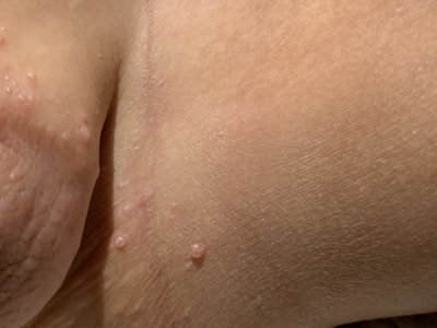 单纯疱疹出现在大腿上,初期是几个小丘疹,随后迅速形成水疱,疱壁变为白色,水疱周围形成红斑,通常没有其他不适,水疱能够自行吸收。