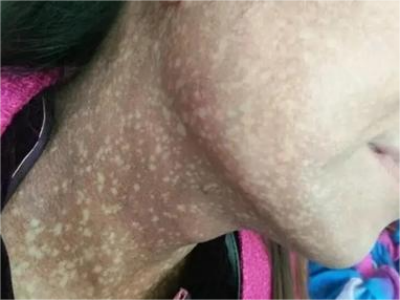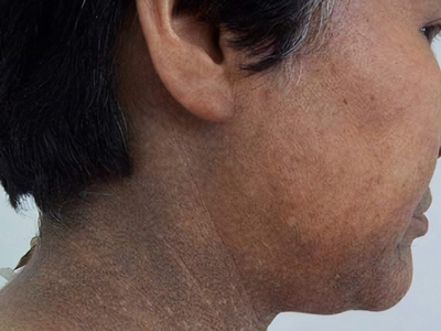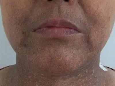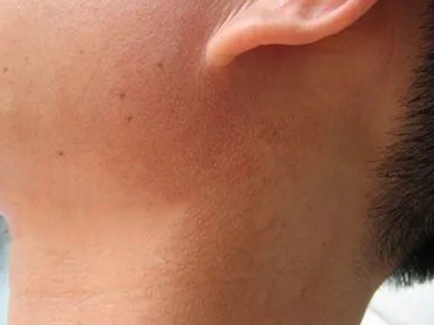 焦油性黑变病累及脖子的暴露部位,患处皮肤出现灰暗色斑,色素沉着越来越明显,呈褐色网状,且皮肤轻度粗糙,呈苔藓样改变,偶尔有痒感。