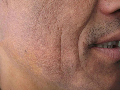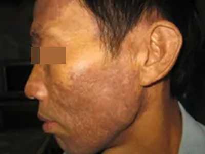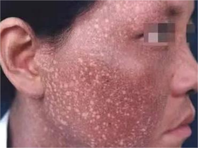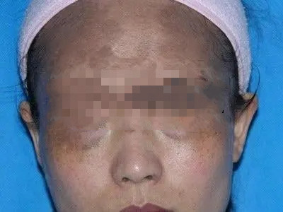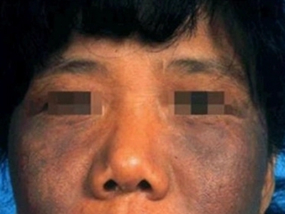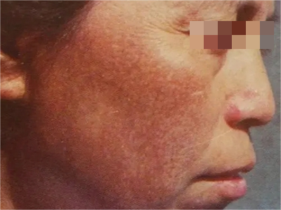 焦油性黑变病累及患者脸部时,特别是脸颊,皮损为褐色、青灰色、棕黑色斑块,斑块大小不等,边界不清,可互相融合形成网状,日晒后症状可加重。