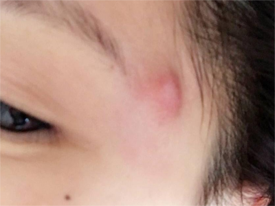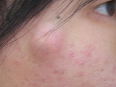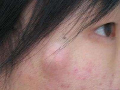 皮脂腺上皮瘤会导致患者的太阳穴处出现一个大红疙瘩,与周围正常皮肤边界不太清晰,疙瘩的顶端泛白,表面光滑,触摸起来质地较软。