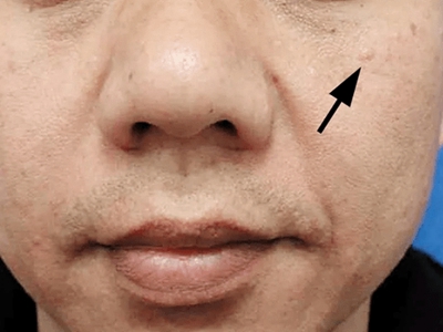 皮脂腺上皮瘤患者左边面部长出一个略微高出皮肤表面的肤色小疙瘩,形状规则,边界清晰。该小疙瘩不痛不痒,生长缓慢,可以通过二氧化碳激光治疗。