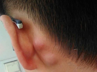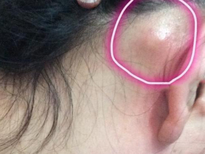 皮脂腺上皮瘤患者在耳后出现两个孤立性结节,表面为肤色,微微泛红,没有疼痛、瘙痒等不适症状,该结节出现迅速生长或继续增多时,应及时就医治疗。
