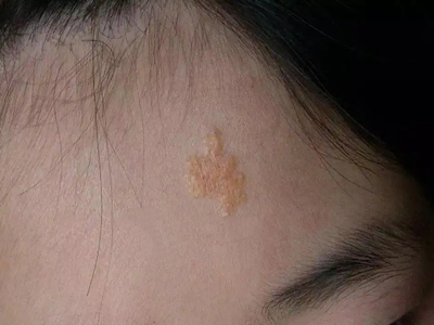 皮脂腺上皮瘤导致患者前额出现一片蜡黄色斑块,生长缓慢,患者没有疼痛等不适。该斑块由患者之前皮损分化形成,并非皮脂腺上皮瘤典型皮损。