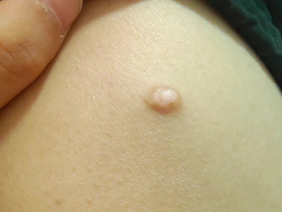 皮脂腺上皮瘤造成患者腹部出现一个直径1cm左右的圆形皮色结节,高出皮肤表面,结节生长较缓慢,患者无疼痛、瘙痒等不适症状。