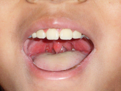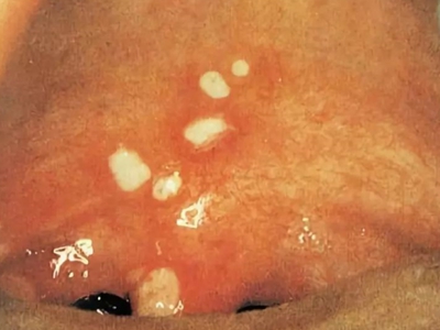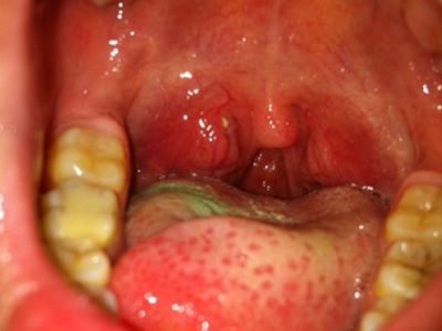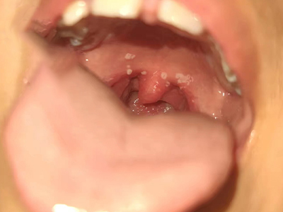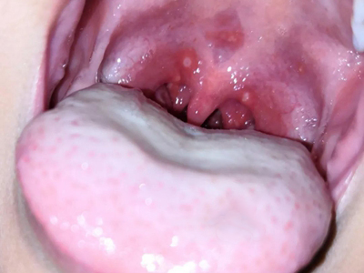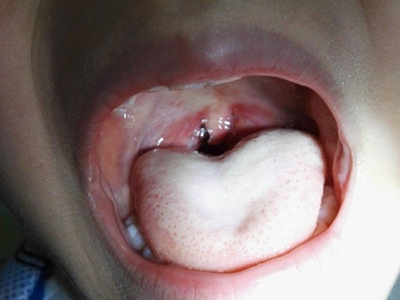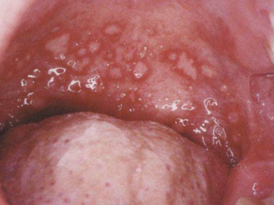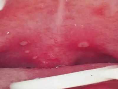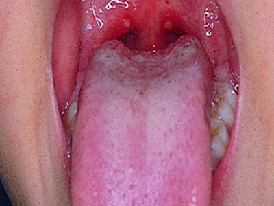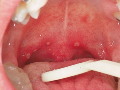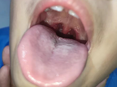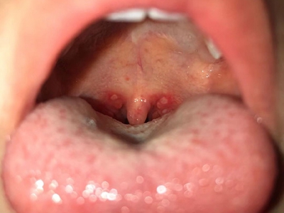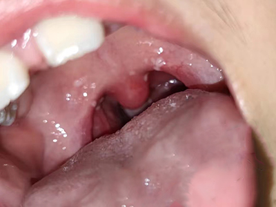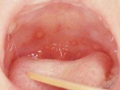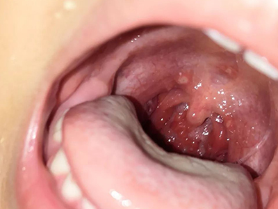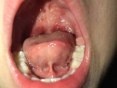疱疹性咽炎潜伏期3-10天,多以突发高热开始,可升至39℃-41℃,伴头痛、咽部不适、肌痛等,婴幼儿常呕吐、拒食,甚至发生高热惊厥;年长儿童常见严重的咽痛、吞咽困难、四肢肌痛、厌食乏力等,持续4-5天后,咽部出现灰白色小丘疹,24小时内发展为水疱和溃疡,其周围绕以直径1-5mm的红晕为特征性的病变,皮损常现于扁桃体前柱、软腭缘和悬雍垂,经1-5天溃疡愈合,一般3天内退热,7日内症状消失。一般疱疹性咽炎往往都伴有牙龈出血、口腔异味,还可伴有颌下淋巴结肿大,但很少波及口腔外部的皮肤。