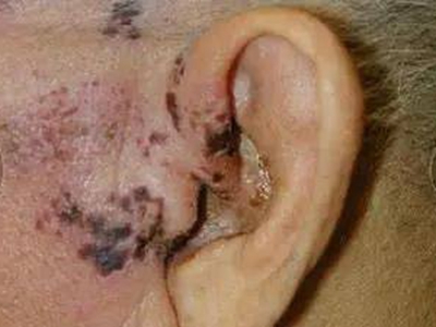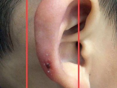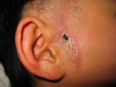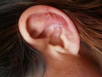寒冷性多形红斑症状严重时表现为耳朵前面皮肤发红、肿胀,上面有很多块聚集分布的黑色干燥坏死性结痂,还有很多水疱破裂后形成的黄褐色结痂,同时皮损向外耳道和其他部位扩散。