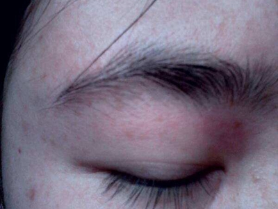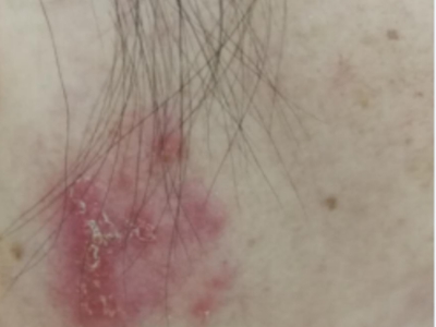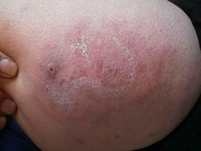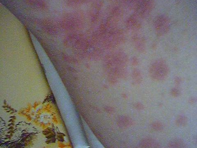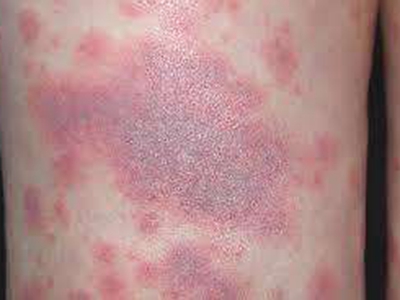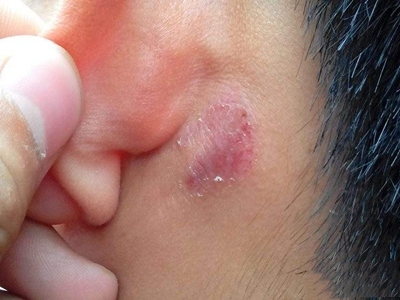 寒冷性多形红斑病情较轻时,表现为耳朵后面出现一个蚕豆大小紫红色斑,形状不规则,自觉瘙痒明显,表面出现反复搔抓导致的脱屑,并伴有轻微糜烂现象。