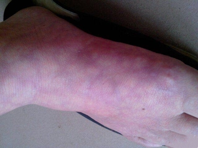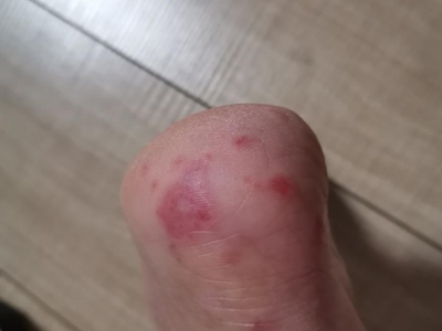 寒冷性多形红斑脚背上有几个暗红色斑块上面有白皮图