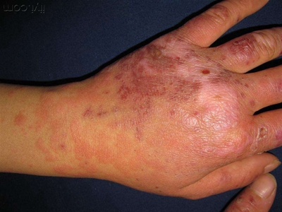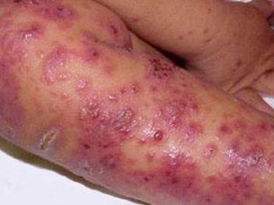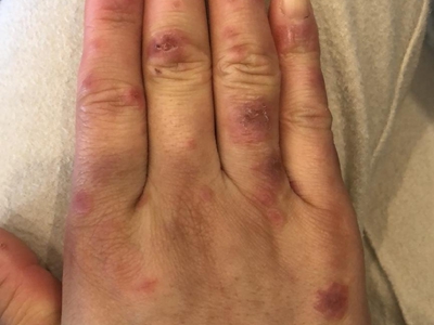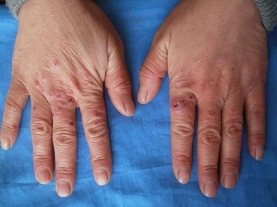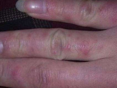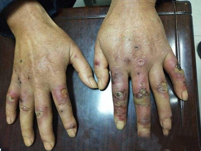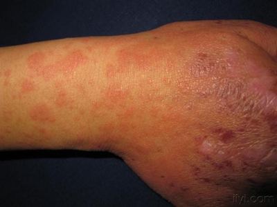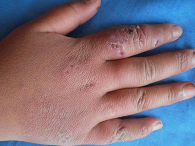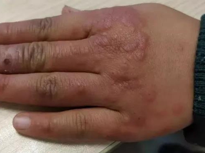 寒冷性多形红斑症状较严重者,手背除有不规则形红斑外,还会有水疱,而且水疱破溃后会在局部形成黄色结痂或糜烂,同时糜烂面凹凸不平,有的呈黑色。