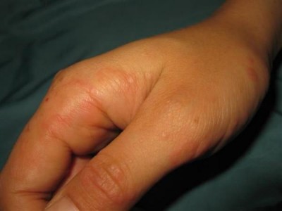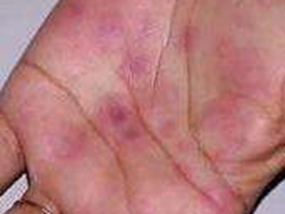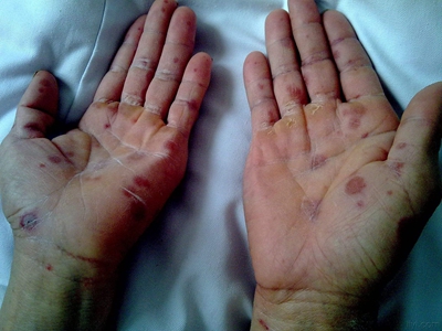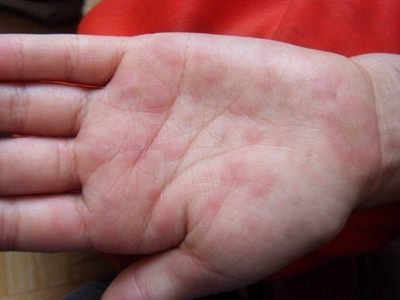 寒冷性多形红斑左手手掌长很多大小不等的红斑图