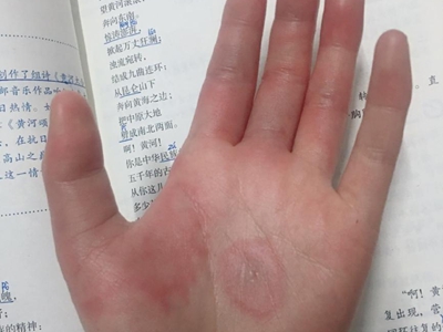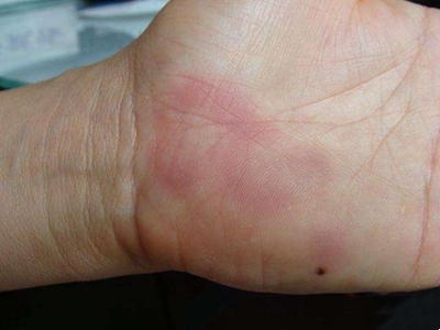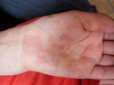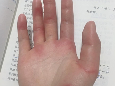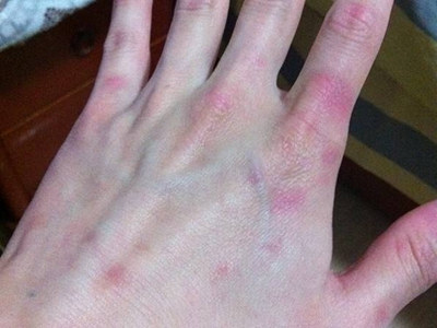 寒冷性多形红斑好发于手掌处,表现为局部有轻微红肿的斑块,界限不清楚,同时有几个大小不等的红疙瘩,会互相聚集、连接成片状。