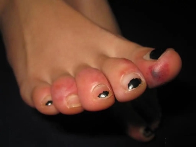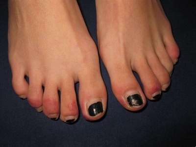 寒冷性多形红斑几个脚趾上有很多暗红色斑块图