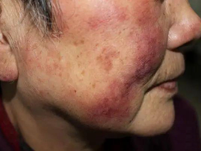 寒冷性多形红斑发于冬天寒冷季节,患者面部出现红色、紫红色斑块,呈圆形,红斑中心部可有水疱,数量不一,糜烂后干燥结痂,患者自觉瘙痒。