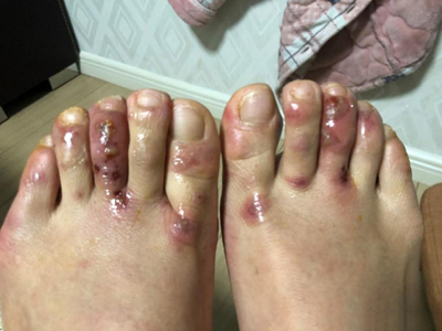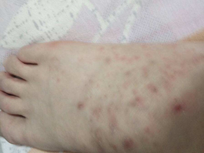 寒冷性多形红斑主要在脚背上出现很多微微凸起的疙瘩,颜色为暗红色,呈藜麦至黄豆大小,自觉有痒感,部分顶端有糜烂或结痂,伴有脱屑现象。