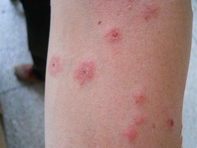 寒冷性多形红斑典型症状为水肿性丘疹,散在分布于患者胳膊上,形状不规则,看起来像红色疙瘩,常伴有瘙痒,部分皮损因搔抓而出现点状结痂或脱皮。