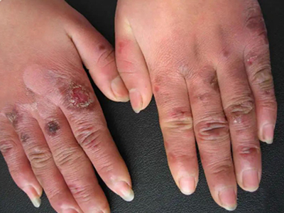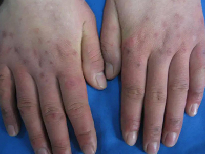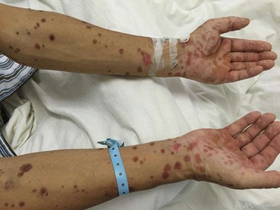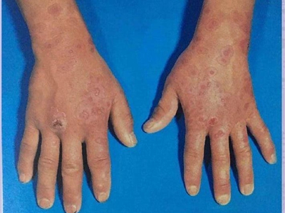 寒冷性多形红斑病情初期可在患者手背部观察到,会出现水肿性斑丘疹或虹膜状红斑,形状不规则,大小不一,严重时会破溃或糜烂,颜色呈紫红色,病损部位皮肤变得干燥、粗糙。