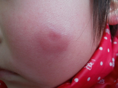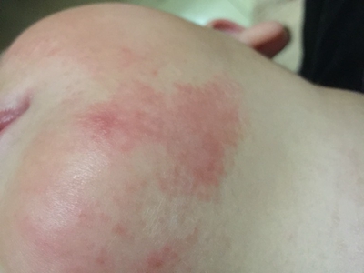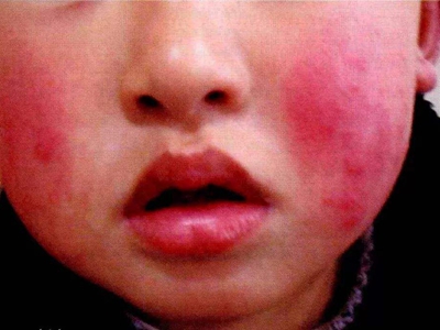 寒冷性多形红斑患者两个脸蛋上出现大面积红斑,略高于皮面,上面有几个鲜红色的斑块,局部皮损升温后有瘙痒感,多与空气寒冷有关。