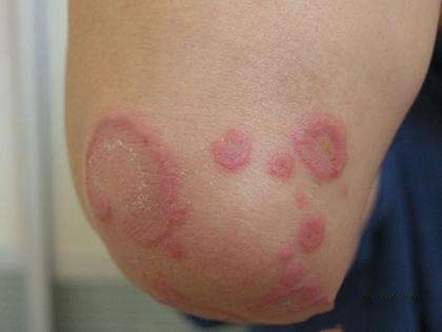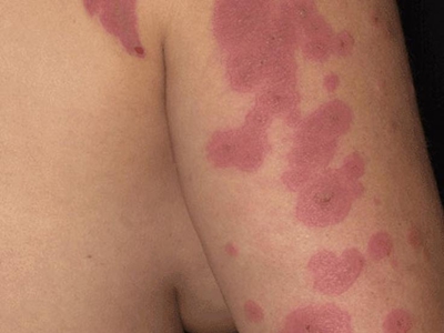 寒冷形多形红斑患者胳膊肘处会出现数量较多的环形红斑,边界还算清晰,大小不一,环形中央的皮肤颜色较浅,部分为正常肤色,伴有一定的疼痛感。
