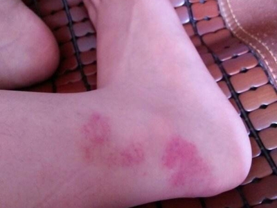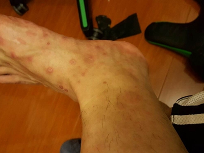 寒冷性多形红斑脚踝周围有很多颜色不一的红斑和红点图