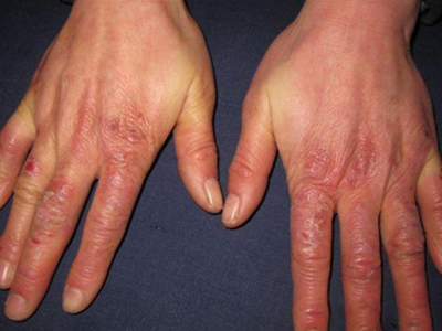 寒冷性多形红斑两个手掌出现很多暗红色斑块干燥图