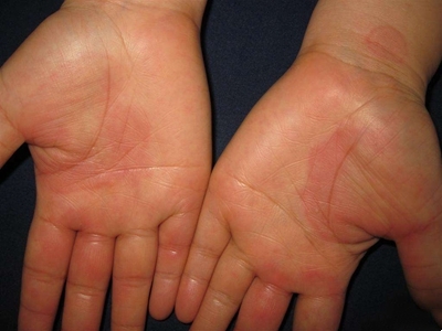 寒冷性多形红斑症状较轻时,表现为左手手掌出现很多水肿性红斑,呈红豆至鸽子蛋大小,形状多不规则,略微高于皮面,主要与长期寒冷刺激有关,若不及时处理则症状加重。