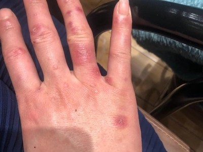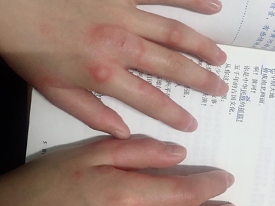 寒冷性多形红斑好发于手背处,皮损为数个大小不等的圆形斑块,颜色为紫红色、淡红色,质地较硬,并高于皮面,有的独立存在,有的聚集分布,部分顶端有血痂出现,伴有轻微瘙痒感。