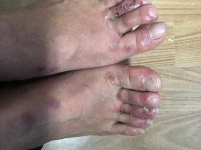 寒冷性多形红斑可在患者脚背部观察到,成批分散的紫红色斑块,其中可带有水疱,有的已经破溃,造成局部渗液、结痂,伴有轻重不同的瘙痒,可外涂抹多磺酸粘多糖乳膏或肝素钠乳膏等改善。